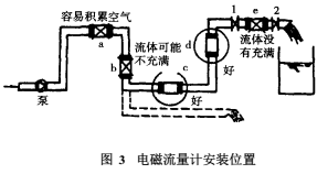 a,b,e為不宜位置(b處可能液體不充滿,a和e處易積聚氣體,且 e處傳感器后管段短也有可能不充滿);對于固液兩相流來說c處亦是不宜位置。