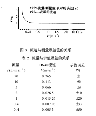 由EMF的測量原理可知,其流量的下限由同噪聲或偏移的信噪比S/N 來決定,其上限則由測量管內(nèi)襯里的磨損和配管的經(jīng)濟(jì)速度等來決定。一般當(dāng)測量管內(nèi)實(shí)際流速小于0.1m/s時,感應(yīng)電動勢已變得十分微弱(幾微伏至零點(diǎn)幾微伏),此時噪聲的影響逐步變?yōu)橹鲗?dǎo),甚至淹沒信號電動勢。其流速和測量誤差的關(guān)系詳見圖 5和表2。