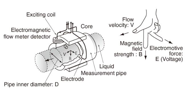 根據法拉*感應定律,在磁場內移動導電液體會產生管內徑,磁場強度和平均流速都成比例的電動勢(電壓)。換句話說,在磁場中移動的液體的流速被轉換成電力。(E正比于V×B×D)