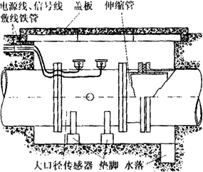 由于大口徑管道在多數場合下是埋在地下的,因此大口徑傳感器在安裝前應做好水泥地坑。圖6-19所示是在給排水系統中常見的安裝形式。水泥地坑應有足夠的活動空間,側壁埋有敷設電纜的鋼管,上有蓋板防止雨淋,下有泄水管以免坑內積水而使傳感器侵水。為了拆裝方便,傳感器應放在墊腳上,且在下游側裝有活絡的伸縮管。圖6-20是測量鹽水流量計在地下水泥管污水排放系統中的安裝實例。