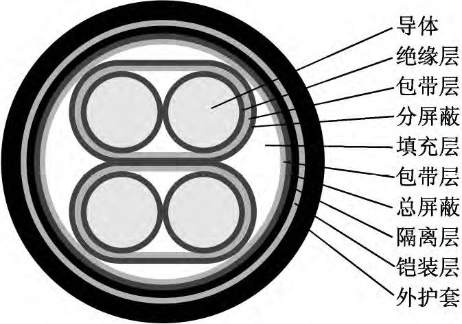 該新型電纜的結構如圖1所示。導體為單股退火鍍錫軟銅線,以提高導體的導電性和防腐蝕性。在導體外繞包一層薄F4(聚四氟乙烯)半導電帶,有利于降低導體和絕緣之間的摩擦起電噪音。絕緣采用材料較為純凈、介電常數較小、具有一定彈性的聚丙烯絕緣級材料,并采用擠壓式擠出,減小絕緣層與導體的間隙。采用對絞組作為信號傳輸線,由于在兩根傳輸線上感應的電壓接近相等,減小了電壓差值,提高了信號傳輸穩定性;對絞組由兩種不同顏色絕緣線芯組成,相鄰線對對絞節距應不大于100mm。對絞分屏蔽組(即對對絞組進行分屏蔽,每對對絞組外繞包兩層聚酯帶和一層厚0.04mm鋁塑復合帶繞包,內置一根7×0.26mm鍍錫銅絞線作引流線)有利于對不同對絞組之間信號串音的抑制和隔離。對絞分屏蔽組同心式絞合成纜,在對絞分屏蔽組間填充非吸濕性材料,以保證纜芯圓整。在成纜纜芯外繞包兩層聚酯帶,再采用鋁塑復合帶繞包,內置鍍錫銅線作引流線,以提高電纜電磁屏蔽能力。總屏蔽層外擠包隔離層(隔離護套),隔離層采用絕緣級低密度聚乙烯材料。隔離層外采用鎧裝層,鎧裝材料為高導磁合金鋼帶,其為強磁材料,可將外來的磁通大部分限制在鎧裝層的外表面上(僅有少部分能進入被屏蔽的空間);鎧裝時對高導磁合金鋼帶采用縱包焊接,確保其形成一連續圓柱管;鎧裝層可提高電纜抗電磁干擾水平以及對電纜進行加強,減少電纜振動引起的電動勢。外護套采用藍色軟PVC(聚氯乙烯)護層級電纜材料擠包,實現電纜防護。