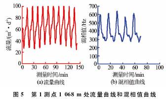 B2-××-××2井是大慶油田采油一廠1口水驅產出井,該井井口計量產液51.72m3/d,取樣化驗含水率81.8%。采用阻抗式含水率計在該井進行了測試,圖5為*1測點深度1068m測量的流量及混相值曲線圖。圖5的流量曲線表明,流量曲線受氣體影響較大,測量流量波動較大,在25~98m3/d之間波動,平均值為58.6m3/d;混相值波動也很大,在280~640Hz之間劇烈波動,平均值圖5*1測點1068m處流量曲線和混相值曲線388Hz。該井測量流量為65.8m3/d,測量含水為51.3%,受井下產氣影響明顯,測量流量明顯高于井口計量流量,測量含水率明顯低于化驗含水率。同時,在該井測井時,使用了儀器上裝有氣體分離器的阻抗式含水率計在該井進行測試,*1測點的流量及混相值曲線見圖6。由于氣體分離器將氣體分離,未進入測量通道,減小了氣體對測量傳感器的影響,測量的流量及混相值曲線波動明顯減少,流量波動為36~78m3/d,平均值為55m3/d;混相值波動為211~288Hz,平均值為228Hz。測量流量為54.8m3/d,測量含水率為80.4%,與井口計量非常接近。對比測量結果表明,氣體對流量及含水率測量造成了非常大的測量誤差,已不能進行準確測量。