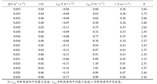 流速沿斷面分布的均勻特性可以通過流速分布不均勻系數(shù)進行表征,通過所選取斷面*大流速和*小流速的差值與該斷面平均流速的比值,δ值越大表明浮體結(jié)構(gòu)的存在對水流斷面流速的分布產(chǎn)生的影響較大。表2中,當來流流量相同時,流速的不均勻系數(shù)多數(shù)隨e的增大而減小。浮體結(jié)構(gòu)位置較小時,主流為浮體結(jié)構(gòu)上部的水流。隨著浮體結(jié)構(gòu)位置的上升,來自上游的水體逐漸分成浮體結(jié)構(gòu)上部和下部的兩股主流,流速分布的不均性減小。浮體結(jié)構(gòu)位置及所處水位條件相同時,來流流量的增大,區(qū)域的平均流速增大,因此流速不均勻性減小。