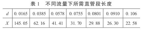 3.直管段長度和成品油流量計(jì)精度的初步預(yù)測在工程設(shè)計(jì)中,根據(jù)流體性質(zhì)、流量和雷諾數(shù)確定α和d值。這樣,按照式(5)就可以依不同的流量計(jì)精度要求,對(duì)直管段長度進(jìn)行初步預(yù)測,或確定直管段長度后,對(duì)流量計(jì)的精度做初步預(yù)測。當(dāng)δ= 0.2%時(shí),不同流量下所需直管段長度見表1。