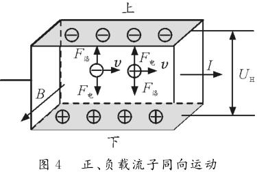 情形2:正、負(fù)載流子反向運動。如圖3所示,長方體玻璃水槽中盛有NaCl的水溶液,水槽左、右側(cè)壁內(nèi)側(cè)各裝一導(dǎo)體片,在溶液中通入水平向右的電流,勻強磁場B垂直紙面向外。NaCl溶液中既有正離子,又有負(fù)離子,根據(jù)左手定則可判斷正離子受到向下的洛倫茲力,故向下運動并堆積。同理,負(fù)離子也受到指向下的洛倫茲力,也向下運動并堆積。由于正負(fù)離子均向下側(cè)面堆積,故上下兩側(cè)面的電勢均為零,但下側(cè)面處離子濃度大于上側(cè)面離子濃度。