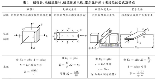 易錯點2:磁強計、印染污水流量計、磁流體發(fā)電機、霍爾元件間的區(qū)別與聯(lián)系磁強計、印染污水流量計、磁流體發(fā)電機、霍爾元件都是利用電磁場對帶電粒子的偏轉(zhuǎn)效應(yīng),并且穩(wěn)定時電場力與磁場力均達(dá)到平衡。很多學(xué)生容易將其混淆,遇到問題常常搞不清原理,亂代公式,筆者特將4者涉及的公式及特點等做一對比區(qū)別如表1所示。