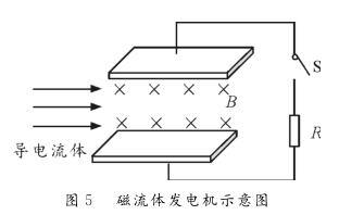 【例1】圖5為磁流體發(fā)電機示意圖。設(shè)兩金屬板間的距離為d,兩極板間勻強磁場的磁感應(yīng)強度為B。等離子體垂直進入磁場的速度為v,單個離子所帶的電荷量為q。離子通道(即兩極板內(nèi)所圍成的空間)的等效電阻為r,負(fù)載電阻為R。則下列判斷正確的是( )