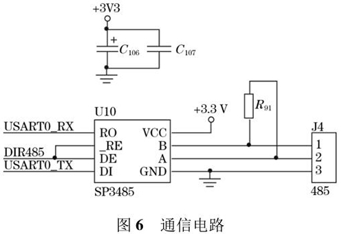 煤焦油流量計(jì)輸出的流量值可以通過外接的 TFTLCD 屏直接顯示,還可以通過預(yù)留的 RS485 通信接口將數(shù)據(jù)發(fā)送到上位機(jī)中。RS485 電路*大的優(yōu)點(diǎn)是 485 電平與 TTL 電平兼容,方便與 TTL 電路相連;抗共模干擾能力強(qiáng);數(shù)據(jù)傳輸速度快,高達(dá) 10 Mbps;通信距離遠(yuǎn),*大為 1.2 km。系統(tǒng)采用 SP3485 芯片進(jìn)行數(shù)據(jù)通信,SP3485 是一款低功耗芯片且符合RS485 協(xié)議的收發(fā)器,電路圖如圖 6 所示。