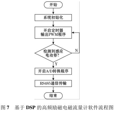 軟件流程圖如圖7 所示。軟件采用模塊化的設(shè)計(jì)方法,主要設(shè)計(jì)了勵(lì)磁控制切換程序、PWM 波產(chǎn)生程序、A/D 轉(zhuǎn)換程序以及 RS485 通信程序等。系統(tǒng)上電后*先執(zhí)行復(fù)位操作,利用 DSP 內(nèi)部的定時(shí)器產(chǎn)生PWM 波控制 H 橋電路中的勵(lì)磁方式,當(dāng)系統(tǒng)檢測到傳感器線圈輸出的感應(yīng)電動(dòng)勢后,利用 DSP 內(nèi)部的 12位 A/D 轉(zhuǎn)換器對此信號進(jìn)行模數(shù)轉(zhuǎn)換,*后根據(jù)相應(yīng)算法計(jì)算出管道中被測液體的流量。