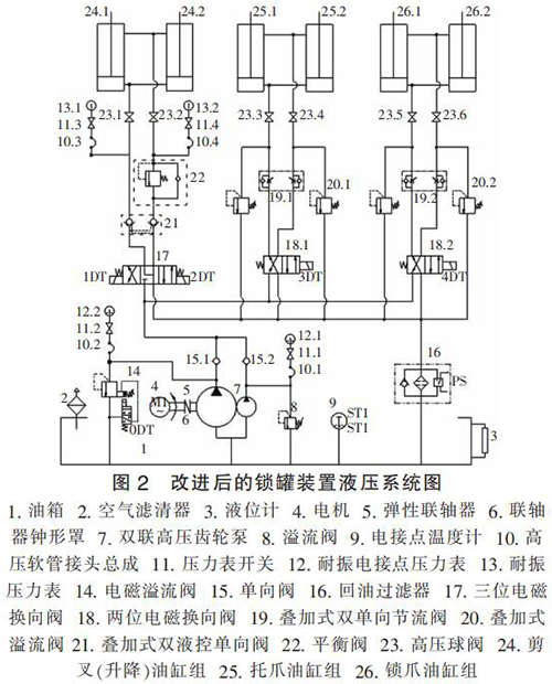 (2)由于升降油缸和托、鎖爪油缸的工況不同,所需油壓也不同,原液壓系統中齒輪泵統一供油,整個工作過程中系統功率消耗大,不夠節(jié)能,工作電機始終帶載運行,不僅功率損耗大,而且易引起油溫急劇增加,對整個提升系統及液壓系統的性能和壽命造成惡劣影響;