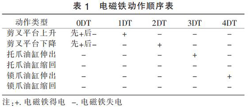 改進后液壓系統工作原理:通過溢流閥調整剪叉油缸工況所需壓力,通過疊加溢流閥來調整托爪和鎖爪工況所需壓力。 剪叉平臺上升(剪叉油缸縮回)或下降(剪叉油缸伸出)時 0DT 先得電,當剪叉油缸到位后 0DT 失電,大泵供油無壓流回油箱。 通過電磁換向閥 17(1DT 和 2DT 的得失電)來控制剪叉油缸的伸出或縮回,通過電磁換向閥 18(3DT 和4DT 的得失電)來控制托爪和鎖爪的伸出和縮回。改進后液壓系統的電磁鐵動作順序如表 1 所示。