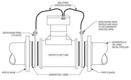 法蘭式流量管:當法蘭式流量管安裝在非金屬,塑料,PVC或襯里的工藝管道之間時,SG必須通過除工藝管道法蘭螺栓之外的其他路徑。在這種安裝方案中,需要接地環或接地電極(圖6)。