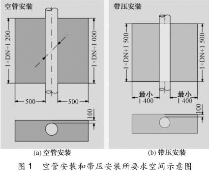 (1)要確認在用智能液體流量計的管壁厚度及內襯材料特性,保證換能器在管段內壁的突出長度;(2)用氣焊切割智能液體流量計外殼時,一定要在管道內充滿水的情況下(*好是帶壓并繼續(xù)保持管內水在運行流動的狀態(tài))進行,以免內襯受熱凸起變形影響流態(tài);(3)要有足夠安裝空間(流量井),可以用原有的流量井,但管壁與流量井墻壁*小距離不小于 500 mm,流量井長不小于 1. 5 倍管徑。超聲波流量計空管安裝和帶壓安裝要求空間如圖 1 所示。