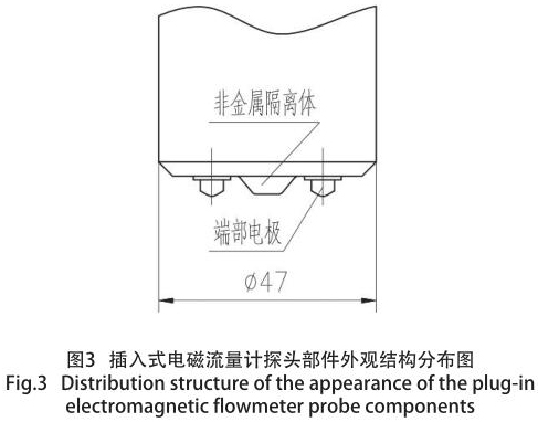通過大量的試驗,對探頭端部外型結構亦采用特殊設計,從而消除兩個電極之間的擾流現象,同時亦消除因通電產生磁場,導致兩個電極吸附介質中的鐵屑而影響測量精度和死區效應,增強了輸出信號的穩定性,從而提高傳感器準確度和抗干擾性。通過結構的優化設計,使用壽命更長,煤層注水流量計探頭局部,如圖 3 所示。