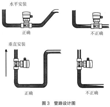 現場安裝時應注意遠離可能對其產生干擾的大型設備,防止長期的熱輻射和其他如磁場直射等環境影響。為確保高測量精度和較好的零點穩定性,進行校正前,智能型電磁流量計應裝入工藝介質中至少 24 小時電極鈍化。安裝的管路設計應確保管道始終充滿流體,防止測量誤差,管路設計圖見圖 3。