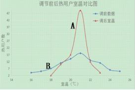 圖3中的曲線 A和B供熱管網智能蒸汽流量計調節前后的熱用戶室溫變化情況,橫坐標表示室溫分布,縱坐標表示熱用戶數量。從圖中可以看出,智能蒸汽流量計調節前熱用戶室溫比較分散,既有室溫小于18℃的熱用戶,也有室溫大于24℃的熱用戶。熱用戶室溫“近熱遠冷”,供熱管網存在水力不平衡現象。智能蒸汽流量計調節后,有49戶用戶室溫在20℃~21℃之間,從圖中可以看出室溫分布范圍縮小,平均室溫降低,從而,不僅減少了供熱量,也大大提高了供熱品質。一般來講,對采暖系統,每增加 1℃平均室溫,能耗增多 5%~10%。采暖系統實現平衡后,常常可以降低平均室溫1℃~3℃。