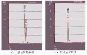 對振動采集器獲取的信號進行譜分析,高溫液體流量計組運轉狀態下主要振動頻率為11.33Hz和12.38Hz,其中12.38Hz為高溫液體流量計轉動頻率;停運時,12.38Hz的高溫液體流量計轉頻消失,11.33Hz的外部激擾力依然存在。