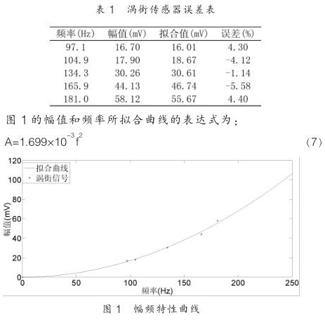 其中 K 1 為儀表系數, D 為管道直徑。在管道口徑 D 不變,流體密度不變的情況下,渦街傳感器的輸出幅值與 f 2 成正比,具體表達形式可以根據實驗測出。本文以 50mm 口徑氣體實驗為例,數據如表 1 所示: