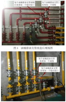 該水電廠在地衣輪機組檢修結(jié)束后針對上述弊端,結(jié)合透平油處理室油焦?fàn)t煤氣流量計布置的現(xiàn)狀,利用無機組檢修工作的汛期期間,對油處理室中油處理焦?fàn)t煤氣流量計進行改造。具體改造內(nèi)容為:將各油桶的進油和排油支管球閥后增加設(shè)置相關(guān)的臨時接口,便于油處理設(shè)備通過活接頭和軟管直接與各個油桶單好連接,可不受機組透平油供油、回油總管的臨時連接口限制。在支管上增設(shè)的臨時接口后各增加一個球閥,以便于將油桶中的油路切斷而進行臨時接頭和軟管的連接。具體改造焦?fàn)t煤氣流量計效果見圖4、圖5所示。