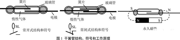 干簧管開關(guān):由一組或幾組導磁金屬簧片封裝在充有惰性氣體的玻璃管中組成的元件,每組簧片既能導磁又能導電,起開關(guān)電路和磁路的雙重作用,如圖1。對于常開型:當干簧管在外加永久磁場或電磁場的作用時,干簧管中的兩根簧片分別被磁化,在兩根簧片接近的地方產(chǎn)生異性磁極而吸引,兩根簧片相接觸使電路導通。反過來,當磁場取消時,簧片依靠本身的彈性力恢復原狀,兩簧片分離,電路斷開,這樣便完成了一個開關(guān)的作用。常閉型干簧管原理可自行分析。干簧開關(guān)有許多優(yōu)點:由于接點密閉在充滿惰性氣體的玻璃管中,不易腐蝕、氧化和污染,接點免于維護;接通或釋放的時間只有1~3毫秒,僅為電磁繼電器的1/5~1/10,可以作為速動開關(guān)使用;由于接點部分使用了金、鐒、鈀合金鍍層,壽命長,開關(guān)約為106~107次。