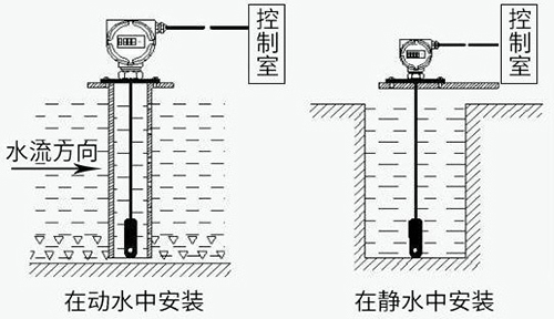 纜式靜壓液位計(靜壓式水位計)通常投入直徑大于水位計直徑的的PVC管、鋼管,管道固定在水中,不同高度打若干小孔,以便水通暢進入管內。或者在底部加裝阻尼裝置,以過濾泥沙和消除動態壓力和波浪對測量的影響。